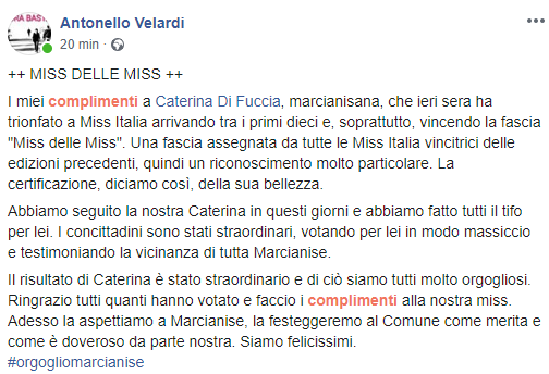 Questo il post pubblicato su Facebook dal Sindaco di Marcianise Antonello Velardi: