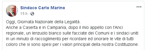 "Oggi, Giornata Nazionale della Legalità. Anche a Caserta e in Campania, dopo il mio appello con l'Anci regionale, un lenzuolo bianco sulle facciate dei Comuni e i sindaci uniti in un minuto di raccoglimento per ricordare ed onorare le vite di tutti coloro che si sono spesi per i valori principali della nostra Costituzione."