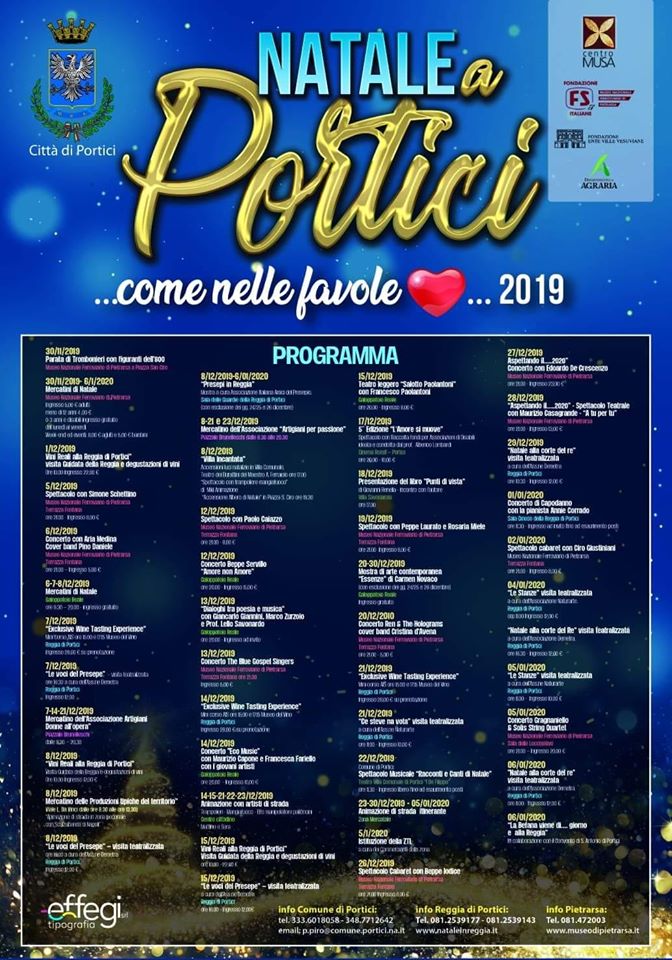 Dopo il successo ottenuto nell’edizione del 2017 e del 2018 anche quest’anno l’Amministrazione Comunale ha inteso organizzare una serie di eventi dal tema natalizio in un ottica complessiva di sviluppo del commercio e del turismo sul territorio: “Natale a Portici ...come nelle favole... ”. La promozione e lo sviluppo del turismo sono obiettivi prioritari per lo sviluppo del territorio; il turismo contribuisce alla crescita civile, culturale e morale delle comunità ospitanti, degli ospiti e dei visitatori. Oltre alle luminarie, alla villa incantata e all’animazione itinerante avremo una serie di iniziative e di spettacoli. Questo programma è reso possibile grazie ad una concreta sinergia tra Enti, presenti sul nostro territorio, i quali assumono iniziative per consentire un’ adeguata offerta dei servizi e delle eccellenze, che vede quale protagonisti, oltre al Comune di Portici, la Fondazione delle Ferrovie dello Stato (Museo Nazionale Ferroviario di Pietrarsa) e il Dipartimento di Agraria della Facoltà Federico II dell’Università di Napoli (Palazzo della Reggia di Portici),la Fondazione ENTE VILLE VESUVIANE e l'ottimo coordinamento dell'ASSESSORE FARRONI e del DIRGENTE LONGO coadiuvato dagli uffici comunali. Pertanto, nell’ambito di una concreta collaborazione e interazione con il MUSA (Museo delle Scienze Agrarie) e Museo Nazionale Ferroviario di Pietrarsa (Fondazione delle Ferrovie dello Stato), è stato redatto il seguente Programma Natalizio dicembre 2019/gennaio 2020: 30/11/2019 ore 9:30 “PARATA DI TROMBONIERI” con figuranti dell’800 dal Museo di Pietrarsa a Piazza San Ciro 30/11/2019- 6/1/2020 #MercatinidiNatale al Museo Nazionale Ferroviario di Pietrarsa Ingresso 5 euro adulti (meno di 12 anni - 4 euro) (0-3 anni e disabili gratuito) dal lunedì al venerdì Week end ed eventi- 8 euro adulti e 5 euro bambino.