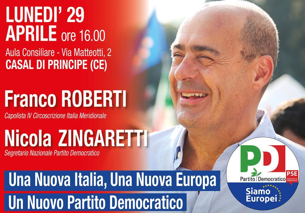 Lunedì 29 aprile, il segretario del Partito Democratico, Nicola Zingaretti, sarà a Casal di Principe. Presso l'aula consiliare, sarà presente oltre a Zingaretti, anche Franco Roberti, Capolista della IV Circoscrizione Italia Meridionale.