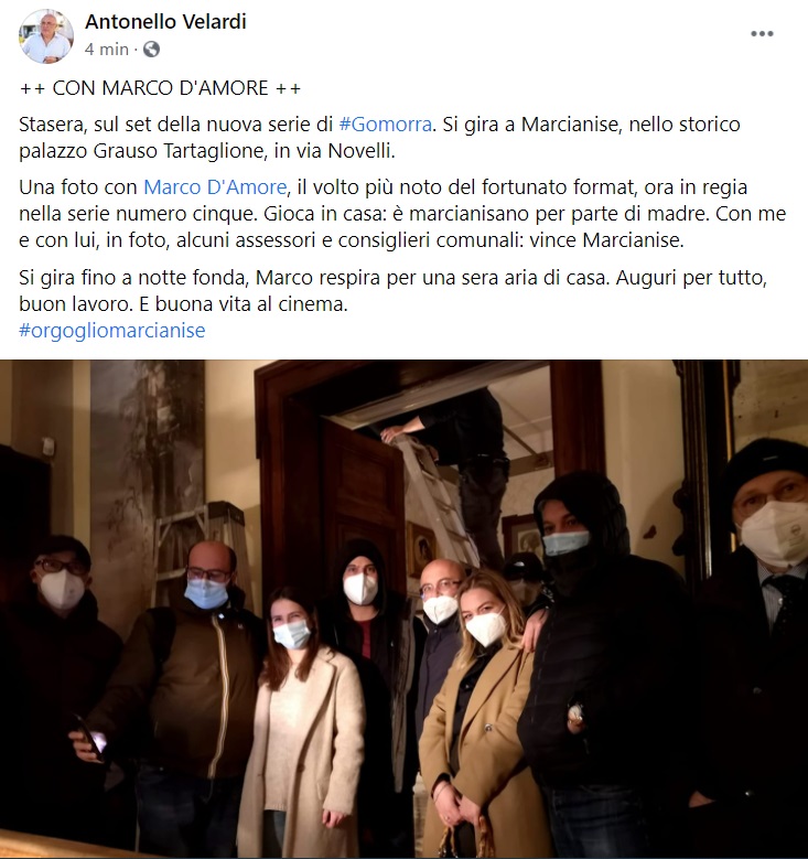 "Stasera, sul set della nuova serie di Gomorra. Si gira a Marcianise, nello storico palazzo Grauso Tartaglione, in via Novelli. -Si legge nella nota- Una foto con Marco D'Amore, il volto più noto del fortunato format, ora in regia nella serie numero cinque. Gioca in casa: è marcianisano per parte di madre. Con me e con lui, in foto, alcuni assessori e consiglieri comunali: vince Marcianise. -Si legge nella nota- Si gira fino a notte fonda, Marco respira per una sera aria di casa. Auguri per tutto, buon lavoro. E buona vita al cinema."