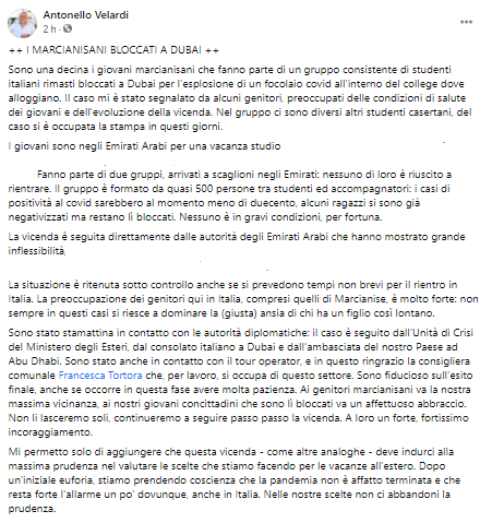 Questo parte del post pubblicato dal Sindaco di Marcianise Antonello Velardi sulla sua pagina Facebook: "I marcianisani bloccati a Dubai: sono una decina i giovani marcianisani che fanno parte di un gruppo consistente di studenti italiani rimasti bloccati a Dubai per l'esplosione di un focolaio covid all'interno del college dove alloggiano. Il caso - si legge nel post - mi è stato segnalato da alcuni genitori, preoccupati delle condizioni di salute dei giovani e dell'evoluzione della vicenda. Nel gruppo ci sono diversi altri studenti casertani, del caso si è occupata la stampa in questi giorni. I giovani sono negli Emirati Arabi per una vacanza studio (...). Fanno parte di due gruppi, arrivati a scaglioni negli Emirati: nessuno di loro è riuscito a rientrare. Il gruppo è formato da quasi 500 persone - si legge ancora nel post - tra studenti ed accompagnatori: i casi di positività al covid sarebbero al momento meno di duecento, alcuni ragazzi si sono già negativizzati ma restano lì bloccati. Nessuno è in gravi condizioni, per fortuna. La vicenda è seguita direttamente dalle autorità degli Emirati Arabi che hanno mostrato grande inflessibilità (...). La situazione - prosegue il sindaco - è ritenuta sotto controllo anche se si prevedono tempi non brevi per il rientro in Italia. La preoccupazione dei genitori qui in Italia, compresi quelli di Marcianise, è molto forte: non sempre in questi casi si riesce a dominare la (giusta) ansia di chi ha un figlio così lontano. Sono stato stamattina in contatto con le autorità diplomatiche: il caso è seguito dall'Unità di Crisi del Ministero degli Esteri - si legge ancora nel post - dal consolato italiano a Dubai e dall'ambasciata del nostro Paese ad Abu Dhabi. Sono stato anche in contatto con il tour operator, e in questo ringrazio la consigliera comunale Francesca Tortora che, per lavoro, si occupa di questo settore. Sono fiducioso sull'esito finale, anche se occorre in questa fase avere molta pazienza. Ai genitori marcianisani - si legge ancora - va la nostra massima vicinanza, ai nostri giovani concittadini che sono lì bloccati va un affettuoso abbraccio. Non li lasceremo soli, continueremo a seguire passo passo la vicenda. A loro un forte, fortissimo incoraggiamento". Mi permetto solo di aggiungere che questa vicenda - come altre analoghe - deve indurci alla massima prudenza nel valutare le scelte che stiamo facendo per le vacanze all'estero. Dopo un'iniziale euforia, stiamo prendendo coscienza che la pandemia non è affatto terminata e che resta forte l'allarme un po' dovunque, anche in Italia. Nelle nostre scelte non ci abbandoni la prudenza".