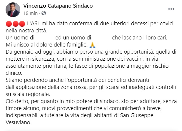 "L'ASL mi ha dato conferma di due ulteriori decessi per covid nella nostra città. Un uomo di ... ed un uomo di ... che lasciano i loro cari. Mi unisco al dolore delle famiglie. Da gennaio ad oggi, abbiamo perso una grande opportunità: quella di mettere in sicurezza, con la somministrazione dei vaccini, in via assolutamente prioritaria, le fasce di popolazione a maggior rischio clinico. -Si legge nella nota- Stiamo perdendo anche l'opportunità dei benefici derivanti dall'applicazione della zona rossa, per gli scarsi ed inadeguati controlli su scala regionale. Ciò detto, per quanto in mio potere di sindaco, sto per adottare, senza timore alcuno, nuovi provvedimenti che vi comunicherò a breve, indispensabili a tutelare la vita degli abitanti di San Giuseppe Vesuviano."