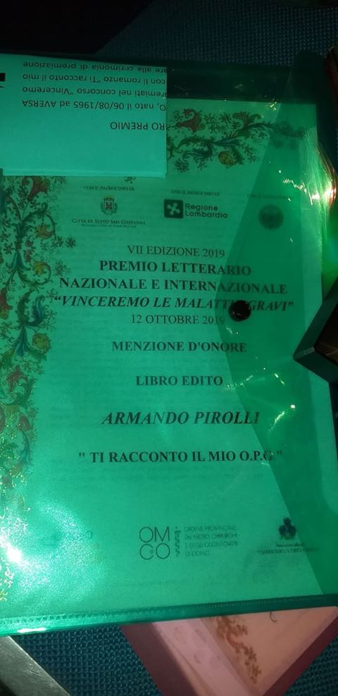 L'Associazione Culturale "Universum Della Verità e Dignità", con il patrocinio della regione Lombardia, del comune di Sesto San Giovanni, dell'Istituto Maestre Pie Dell'Addolorata e dell'ordine dei Medici di Como e Milano, nell'ambito del Premio Letterario Nazionale e Internazionale" Vinceremo le Malattie Gravi " hanno conferito la Menzione d'onore al romanzo "Ti racconto il mio O. P. G." scritto dall'ottimo artista aversano Armando Pirolli al quale vanno i nostri complimenti per l'eccellente lavoro.
