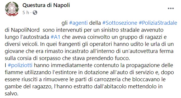 Questo il post pubblicato sulla pagina Facebook della Questura di Napoli: "... gli agenti della Sottosezione Polizia Stradale di Napoli Nord sono intervenuti per un sinistro stradale avvenuto lungo l’autostrada A1 che aveva coinvolto un gruppo di ragazzi e diversi veicoli. In quei frangenti - recita il post - gli operatori hanno udito le urla di un giovane che era rimasto incastrato all’interno di un’autovettura ferma sulla corsia di sorpasso che stava prendendo fuoco. I poliziotti - si legge nel post - hanno immediatamente contenuto la propagazione delle fiamme utilizzando l’estintore in dotazione all’auto di servizio e, dopo essere riusciti a rimuovere le parti di carrozzeria che bloccavano le gambe del ragazzo, l’hanno estratto dall’abitacolo mettendolo in salvo".