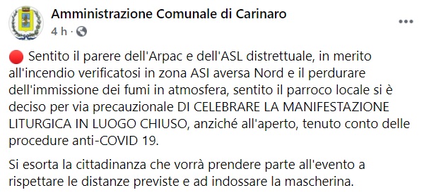 Questo quanto pubblicato sulla pagina fb dell'Amm. comunale di Carinaro:" Sentito il parere dell'Arpac e dell'ASL distrettuale, in merito all'incendio verificatosi in zona ASI aversa Nord e il perdurare dell'immissione dei fumi in atmosfera, sentito il parroco locale si è deciso per via precauzionale DI CELEBRARE LA MANIFESTAZIONE LITURGICA IN LUOGO CHIUSO, anziché all'aperto, tenuto conto delle procedure anti-COVID 19. Si esorta la cittadinanza che vorrà prendere parte all'evento a rispettare le distanze previste e ad indossare la mascherina."