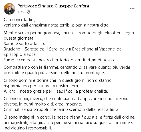Lo apprendiamo dalla pagina Facebook del Portavoce del Sindaco di Sarno, Giuseppe Canfora.