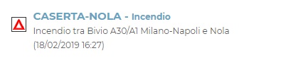Questo è quanto apprendiamo dal sito di Autostrade per l'Italia, ovvero un incendio sulla Caserta-Nola al bivio A30/A1.