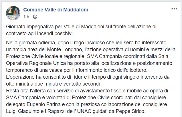 Questo quanto comunicato dalla pagina facebook del Comune di Valle di Maddaloni