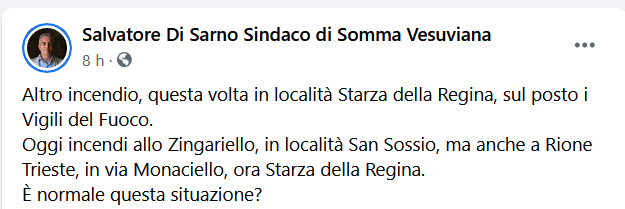 Questo il post pubblicato sulla pagina Facebook del sindaco di Somma Vesuviana, Salvatore Di Sarno: "Altro incendio, questa volta in località Starza della Regina, sul posto i Vigili del Fuoco. Oggi - si legge - incendi allo Zingariello, in località San Sossio, ma anche a Rione Trieste, in via Monaciello, ora Starza della Regina. È normale questa situazione"?