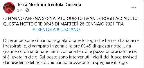 "CI HANNO APPENA SEGNALATO QUESTO GRANDE ROGO ACCADUTO QUESTA NOTTE ORE 00:45 DI MARTEDÌ 26 GENNAIO 2021 TRA ...Trentola e Lusciano ...Diverse persone ci hanno segnalato questo rogo che ha reso l'aria acre irrespirabile, divampato in zona alle ore 00:45 di questa notte. Una grande colonna di fumo nero con una terribile puzza di bruciato acre, si è levata in cielo. Sul posto sono intervenuti i vigili del fuoco avvisati dai residenti del posto che hanno provveduto a spegnere il rogo."