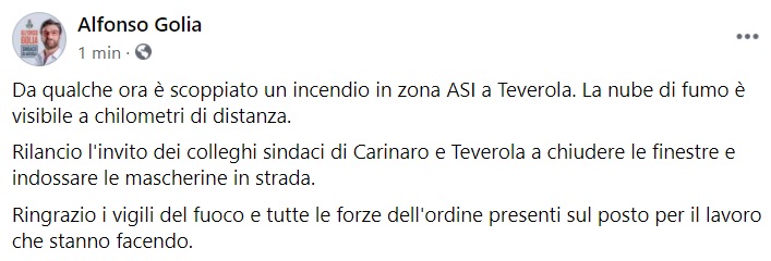 Questo quanto pubblicato sulla pagina fb del Sindaco di Aversa Golia: "Da qualche ora è scoppiato un incendio in zona ASI a Teverola. La nube di fumo è visibile a chilometri di distanza. Rilancio l'invito dei colleghi sindaci di Carinaro e Teverola a chiudere le finestre e indossare le mascherine in strada. Ringrazio i vigili del fuoco e tutte le forze dell'ordine presenti sul posto per il lavoro che stanno facendo."