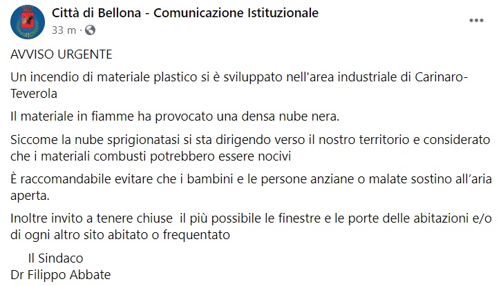 Questo quanto pubblicato sulla pagina fb del Comune di Bellona: "AVVISO URGENTE Un incendio di materiale plastico si è sviluppato nell'area industriale di Carinaro-Teverola Il materiale in fiamme ha provocato una densa nube nera. Siccome la nube sprigionatasi si sta dirigendo verso il nostro territorio e considerato che - si legge nella nota - i materiali combusti potrebbero essere nocivi È raccomandabile evitare che i bambini e le persone anziane o malate sostino all’aria aperta. Inoltre invito a tenere chiuse il più possibile le finestre e le porte delle abitazioni e/o di ogni altro sito abitato o frequentato Il Sindaco Dr Filippo Abbate".