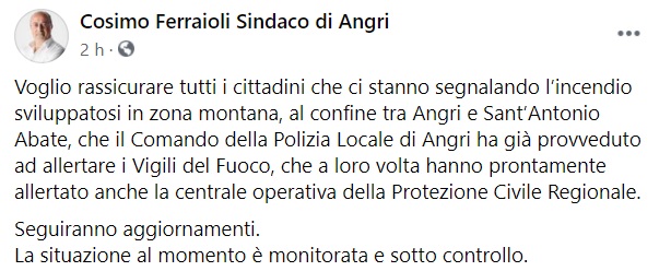 "Voglio rassicurare tutti i cittadini che ci stanno segnalando l’incendio sviluppatosi in zona montana, al confine tra Angri e Sant’Antonio Abate, che il Comando della Polizia Locale di Angri ha già provveduto- si legge nella nota- ad allertare i Vigili del Fuoco, che a loro volta hanno prontamente allertato anche la centrale operativa della Protezione Civile Regionale. Seguiranno aggiornamenti. La situazione al momento è monitorata e sotto controllo."