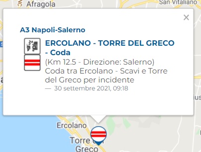 "A3 Napoli-Salerno. Coda ERCOLANO - TORRE DEL GRECO - Coda (Km 12.5 - Direzione: Salerno) Coda tra Ercolano - Scavi e Torre del Greco per incidente"