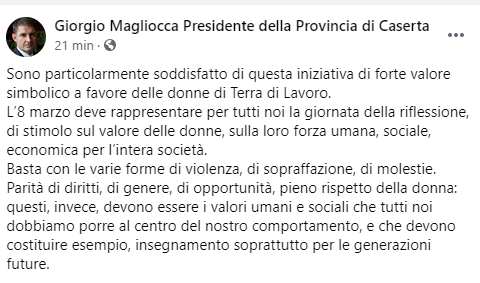 Questo il post pubblicato dal Presidente della Provincia di Terra di Lavoro Giorgio Magliocca sulla sua pagina Faceboolk: "Sono particolarmente soddisfatto di questa iniziativa di forte valore simbolico a favore delle donne di Terra di Lavoro. L’8 marzo deve rappresentare per tutti noi la giornata della riflessione, di stimolo sul valore delle donne, sulla loro forza umana, sociale, economica per l’intera società. Basta - prosegue il Presidente - con le varie forme di violenza, di sopraffazione, di molestie. Parità di diritti, di genere, di opportunità, pieno rispetto della donna: questi, invece, devono essere i valori umani e sociali che tutti noi dobbiamo porre al centro del nostro comportamento, e che devono costituire esempio, insegnamento - conclude il post - soprattutto per le generazioni future".