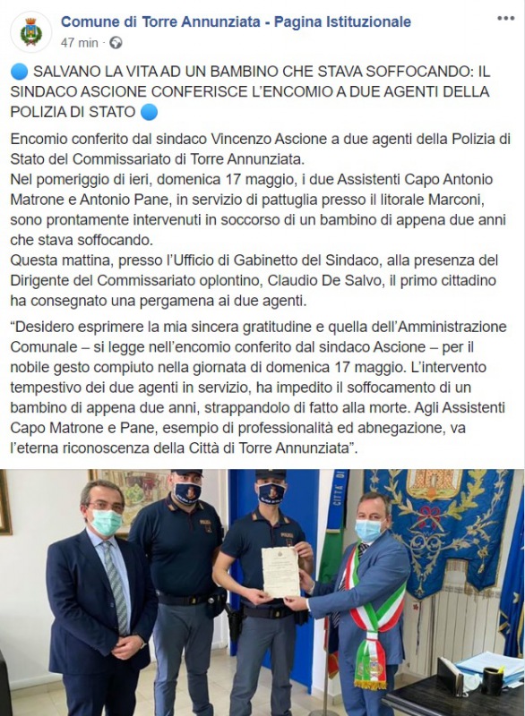 Questo quanto pubblicato sulla pagina facebook del Comune di Torre Annunziata: