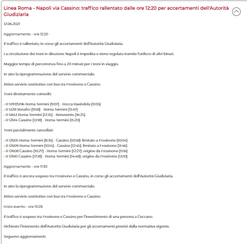 Lo apprendiamo dal sito di Trenitalia: "Ore 10.05 Il traffico è sospeso tra Frosinone e Cassino per l'investimento di una persona a Ceccano. Richiesto l'intervento dell'Autorità Giudiziaria per gli accertamenti previsti dalla normativa vigente. Aggiornamento ore 11.30 Il traffico è ancora sospeso tra Frosinone e Cassino, in corso gli accertamenti dell'Autorità Giudiziaria. In atto la riprogrammazione del servizio commerciale. Attivo servizio sostitutivo con bus tra Frosinone e Cassino. (...). Aggiornamento ore 12.20 Il traffico è rallentato, in corso gli accertamenti dell'Autorità Giudiziaria. La circolazione dei treni in direzione di Napoli è impedita e vene regolata tramite l'utilizzo di altri binari. Maggior tempo di percorrenza fino a 20 minuti per i treni in viaggio. In atto la riprogrammazione del servizio commerciale. Attivo servizio sostitutivo con bus tra Frosinone e Cassino. Treni direttamente coinvolti (...)". Al momento il traffico è regolare.