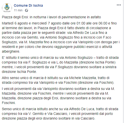 Questo il testo del post pubblicato sulla pagina Facebook del Comune di Ischia: