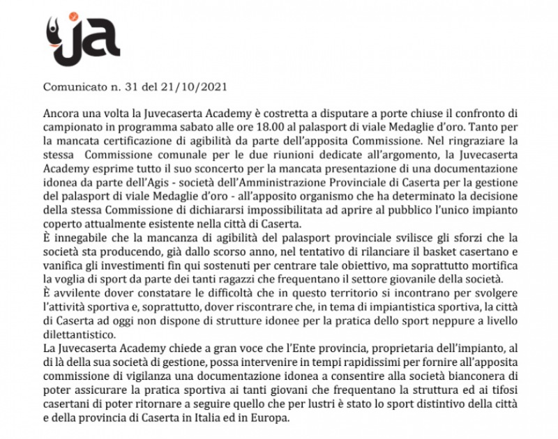 "Ancora una volta la Juvecaserta Academy è costretta a disputare a porte chiuse il confronto di campionato in programma sabato alle ore 18.00 al palasport di viale Medaglie d’oro. Tanto per la mancata certificazione di agibilità da parte dell’apposita Commissione. Nel ringraziare la stessa Commissione comunale per le due riunioni dedicate all’argomento, la Juvecaserta Academy esprime- si legge nella nota- tutto il suo sconcerto per la mancata presentazione di una documentazione idonea da parte dell’Agis - società dell’Amministrazione Provinciale di Caserta per la gestione del palasport di viale Medaglie d’oro - all’apposito organismo che ha determinato la decisione della stessa Commissione di dichiararsi impossibilitata ad aprire al pubblico l’unico impianto coperto attualmente esistente nella città di Caserta. È innegabile che la mancanza di agibilità del palasport provinciale svilisce gli sforzi che la società sta producendo, già dallo scorso anno, nel tentativo di rilanciare il basket casertano e vanifica gli investimenti fin qui sostenuti per centrare tale obiettivo, ma soprattutto mortifica la voglia di sport da parte dei tanti ragazzi che frequentano il settore giovanile della società. È avvilente dover constatare le difficoltà che in questo territorio si incontrano per svolgere l’attività sportiva e, soprattutto, dover riscontrare che, in tema di impiantistica sportiva, la città di Caserta ad oggi non dispone di strutture idonee per la pratica dello sport neppure a livello dilettantistico. La Juvecaserta Academy chiede a gran voce che l’Ente provincia, proprietaria dell’impianto, al di là della sua società di gestione, possa intervenire- si legge nella nota- in tempi rapidissimi per fornire all’apposita commissione di vigilanza una documentazione idonea a consentire alla società bianconera di poter assicurare la pratica sportiva ai tanti giovani che frequentano la struttura ed ai tifosi casertani di poter ritornare a seguire quello che per lustri è stato lo sport distintivo della città e della provincia di Caserta in Italia ed in Europa."