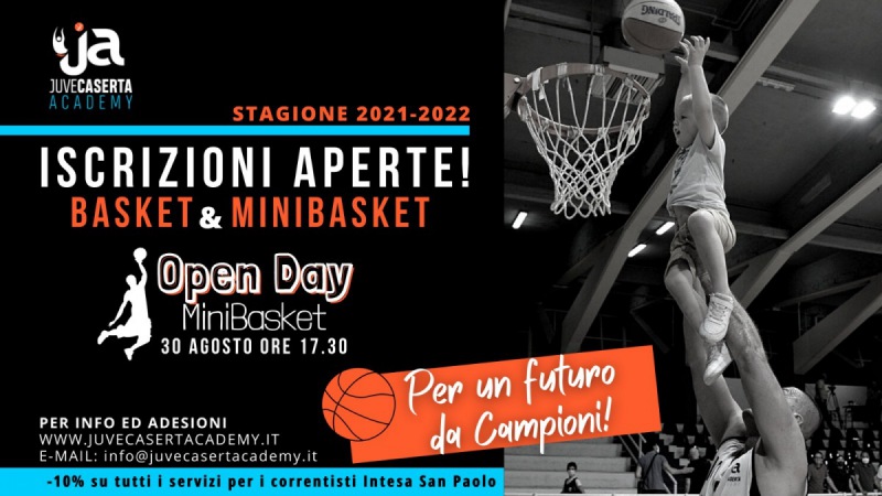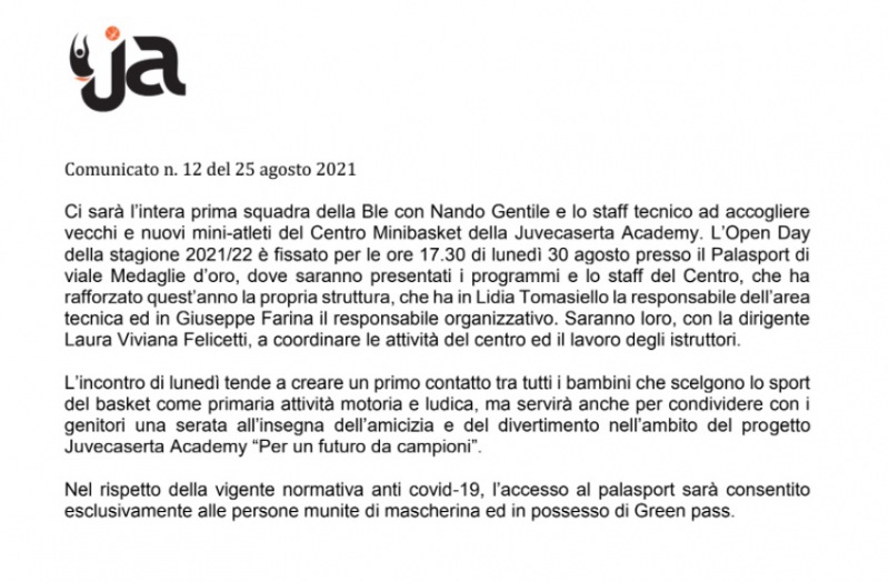 "Ci sarà l’intera prima squadra della Ble con Nando Gentile e lo staff tecnico ad accogliere vecchi e nuovi mini-atleti del Centro Minibasket della Juvecaserta Academy. L’Open Day della stagione 2021/22 è fissato per le ore 17.30 di lunedì 30 agosto presso il Palasport di viale Medaglie d’oro, dove saranno presentati- si legge nella nota- i programmi e lo staff del Centro, che ha rafforzato quest’anno la propria struttura, che ha in Lidia Tomasiello la responsabile dell’area tecnica ed in Giuseppe Farina il responsabile organizzativo. Saranno loro, con la dirigente Laura Viviana Felicetti, a coordinare le attività del centro ed il lavoro degli istruttori. L’incontro di lunedì tende a creare un primo contatto tra tutti i bambini che scelgono lo sport del basket come primaria attività motoria e ludica, ma servirà anche per condividere con i genitori una serata all’insegna dell’amicizia e del divertimento nell’ambito del progetto Juvecaserta Academy “Per un futuro da campioni”. Nel rispetto della vigente normativa anti covid-19, l’accesso al palasport- si legge nella nota- sarà consentito esclusivamente alle persone munite di mascherina ed in possesso di Green pass."