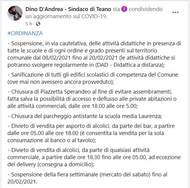 Questo quanto apprendiamo dalla pagina facebook del Sindaco di Teano: