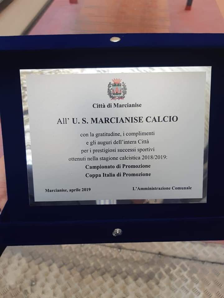 Coppa Italia di Promozione...Un risultato storico per il calcio marcianisano!!! Il sindaco Antonello Velardi ha voluto omaggiare con targa e medaglie l'intera squadra, con direttivo e staff tecnico, come segno di ringraziamento per il lustro dato a Marcianise e come buon auspicio per la prossima stagione calcistica.