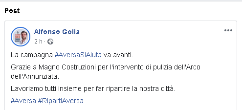 "La campagna Aversa Si Aiuta va avanti. Grazie a Magno Costruzioni per l'intervento di pulizia dell'Arco dell'Annunziata. Lavoriamo tutti insieme per far ripartire la nostra città."