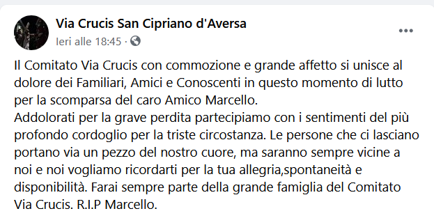 Questo il post pubblicato sulla pagina Facebook della Via Crucis San Cipriano d'Aversa: "Il Comitato Via Crucis con commozione e grande affetto si unisce al dolore dei Familiari, Amici e Conoscenti in questo momento di lutto per la scomparsa del caro Amico Marcello. Addolorati per la grave perdita - si legge nel post - partecipiamo con i sentimenti del più profondo cordoglio per la triste circostanza. Le persone che ci lasciano portano via un pezzo del nostro cuore, ma saranno sempre vicine a noi e noi vogliamo ricordarti per la tua allegria,spontaneità e disponibilità. Farai sempre parte della grande famiglia del Comitato Via Crucis - conclude. R.I.P Marcello".