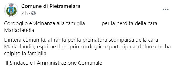 Questo il messaggio di cordoglio che apprendiamo dalla pagina facebook del Comune di Pietramelara: "Cordoglio e vicinanza alla famiglia ... per la perdita della cara Mariaclaudia. L’intera comunità, affranta per la prematura scomparsa della cara Mariaclaudia, esprime il proprio cordoglio e partecipa al dolore che ha colpito la famiglia ... Il Sindaco e l’Amministrazione Comunale"