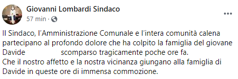 Questo parte del post pubblicato sulla sua pagina Facebook dal Sindaco di Calvi Risorta Giovanni Lombardi: "Il Sindaco, l’Amministrazione Comunale - si legge nel post - e l’intera comunità calena partecipano al profondo dolore che ha colpito la famiglia del giovane Davide (...), scomparso tragicamente poche ore fa. Che il nostro affetto e la nostra vicinanza giungano alla famiglia di Davide in queste ore - conclude il comunicato - di immensa commozione".