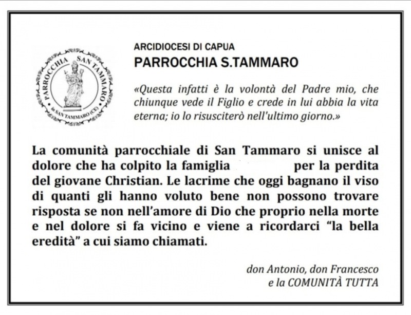 Questo il messaggio di cordoglio pubblicato sulla pagina Facebook 'Parrocchia San Tammaro':