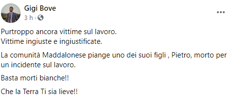 Vittime ingiuste e ingiustificate. La comunità Maddalonese - si legge nel post - piange uno dei suoi figli, Pietro, morto per un incidente sul lavoro. Basta morti bianche - conclude il post - Che la Terra Ti sia lieve!".