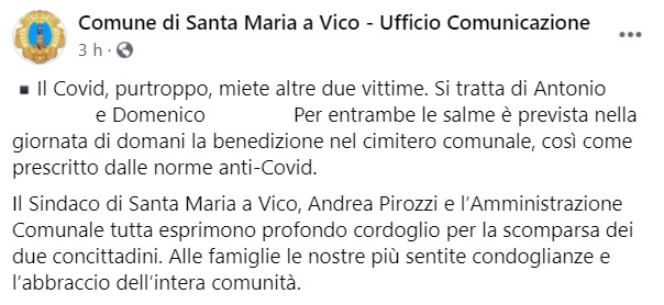 Questo il messaggio di cordoglio che apprendiamo dalla pagina facebook del Comune di SMAV: "Il Covid, purtroppo, miete altre due vittime. Si tratta di Antonio ... e Domenico ... . Per entrambe le salme è prevista nella giornata di domani la benedizione nel cimitero comunale - si legge nella nota -, così come prescritto dalle norme anti-Covid. Il Sindaco di Santa Maria a Vico, Andrea Pirozzi e l’Amministrazione Comunale tutta esprimono profondo cordoglio per la scomparsa dei due concittadini. Alle famiglie le nostre più sentite condoglianze e l’abbraccio dell’intera comunità."