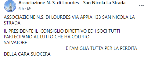 Questo parte del post pubblicato sulla pagina Facebook 'Associazione N.S. di Lourdes - San Nicola la Strada: "ASSOCIAZIONE N.S. DI LOURDES VIA APPIA 133 SAN NICOLA LA STRADA. Il Presidente il Consiglio direttivo ed i soci tutti partecipano al lutto che ha colpito (...) Salvatore (...) e famiglia tutta per la perdita della cara suocera".