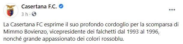 Questo il post pubblicato sulla pagina Facebook della Casertana FC: "La Casertana FC esprime il suo profondo cordoglio per la scomparsa di Mimmo Bovienzo, vicepresidente dei falchetti dal 1993 al 1996, nonché grande appassionato dei colori rossoblu.".