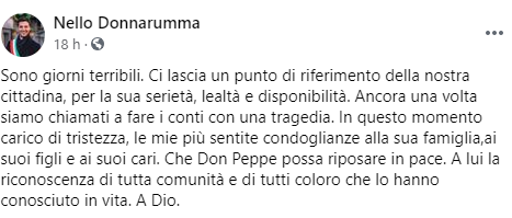 Questo il post pubblicato sulla sua pagina Facebook dal Sindaco di Palma Campania Nello Donnarumma: "Sono giorni terribili. Ci lascia un punto di riferimento della nostra cittadina, per la sua serietà, lealtà e disponibilità. Ancora una volta - si legge nel post - siamo chiamati a fare i conti con una tragedia. In questo momento carico di tristezza, le mie più sentite condoglianze alla sua famiglia,ai suoi figli e ai suoi cari. Che Don Peppe possa riposare in pace. A lui la riconoscenza di tutta comunità - conclude il post - e di tutti coloro che lo hanno conosciuto in vita. A Dio".