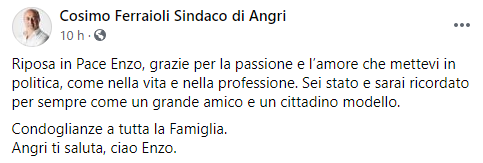 Questo il post pubblicato sulla sua pagina Facebook dal Sindaco di Angri Cosimo Ferraioli: "Riposa in Pace Enzo, grazie per la passione e l’amore che mettevi in politica, come nella vita e nella professione. Sei stato e sarai ricordato per sempre come un grande amico e un cittadino modello. Condoglianze - si legge nel post - a tutta la Famiglia. Angri ti saluta, ciao Enzo".