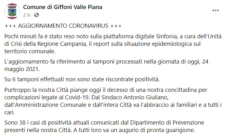 "Pochi minuti fa è stato reso noto sulla piattaforma digitale Sinfonia, a cura dell'Unità di Crisi della Regione Campania, il report sulla situazione epidemiologica sul territorio comunale. L'aggiornamento fa riferimento ai tamponi processati nella giornata di oggi, 24 maggio 2021. -Si legge nella nota- Su 6 tamponi effettuati non sono state riscontrate positività. Purtroppo la nostra Città piange oggi il decesso di una nostra concittadina per complicazioni legate al Covid-19. Dal Sindaco Antonio Giuliano, dall'Amministrazione Comunale e dall'intera Città va l'abbraccio ai familiari e a tutti i cari. -Si legge nella nota- Sono 38 i casi di positività attuali comunicati dal Dipartimento di Prevenzione presenti nella nostra Città. A tutti loro va un augurio di pronta guarigione."
