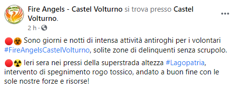 Questo parte del post pubblicato sulla pagina Facebook 'Fire Angels - Castel Volturno', gruppo di volontari cittadini che controllano il territorio, per prevenire l'accensione di roghi e sversamenti illegali di rifiuti: "Sono giorni e notti di intensa attività antiroghi per i volontari Fire Angels Castel Volturno, solite zone di delinquenti senza scrupolo. Ieri sera - si legge - nei pressi della superstrada altezza Lago Patria, intervento di spegnimento rogo tossico, andato a buon fine con le sole nostre forze e risorse".