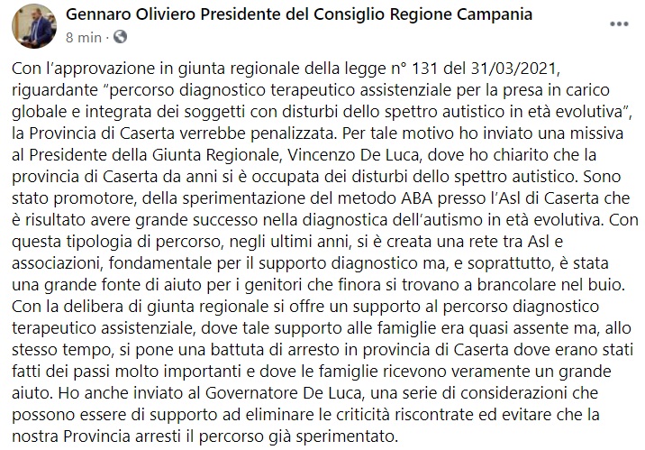 Questo quanto apprendiamo dalla pagoina fb del Pres. Cons. Reg. Campania Gennaro Oliviero: "Con l’approvazione in giunta regionale della legge n° 131 del 31/03/2021, riguardante “percorso diagnostico terapeutico assistenziale per la presa in carico globale e integrata dei soggetti con disturbi dello spettro autistico in età evolutiva”, la Provincia di Caserta - si legge nella nota - verrebbe penalizzata. Per tale motivo ho inviato una missiva al Presidente della Giunta Regionale, Vincenzo De Luca, dove ho chiarito che la provincia di Caserta da anni si è occupata dei disturbi dello spettro autistico. Sono stato promotore, della sperimentazione del metodo ABA presso l’Asl di Caserta che è risultato avere grande successo nella diagnostica dell’autismo in età evolutiva. Con questa tipologia di percorso - si legge nella nota -, negli ultimi anni, si è creata una rete tra Asl e associazioni, fondamentale per il supporto diagnostico ma, e soprattutto, è stata una grande fonte di aiuto per i genitori che finora si trovano a brancolare nel buio. Con la delibera di giunta regionale si offre un supporto al percorso diagnostico terapeutico assistenziale, dove tale supporto alle famiglie era quasi assente ma, allo stesso tempo, si pone una battuta di arresto in provincia di Caserta dove erano stati fatti dei passi molto importanti e dove le famiglie ricevono veramente un grande aiuto. Ho anche inviato al Governatore De Luca, una serie di considerazioni che possono essere di supporto ad eliminare le criticità riscontrate - si legge nella nota - ed evitare che la nostra Provincia arresti il percorso già sperimentato."