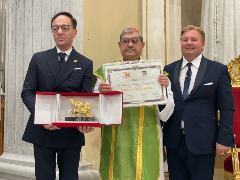 Questo il comunicato diramato dall'ufficio stampa DGS: "Il premio è stato consegnato stamane al Tempio dell’Incoronata, il cardinale: «Ringrazio tutti, spero di aver lasciato segni di speranza per una città piena di problemi ma anche di eccellenze». Il cardinale Crescenzio Sepe ha ricevuto a Napoli il “Gran Premio internazionale Leone d’oro di Venezia” dalle mani del console della Federazione Russa in Napoli e Presidente di Confesercenti Campania, Vincenzo Schiavo. A premiarlo - si legge nel comunicato - anche il presidente della Fondazione “Leone D’Oro” Sileno Candelaresi. La consegna del prestigioso premio "alla carriera" si è svolta stamane presso Il Tempio dell’Incoronata, Basilica Pontificia, di Capodimonte. L’ex arcivescovo di Napoli Sepe è stato insignito del riconoscimento per l’impegno e i nobili obiettivi conseguiti sia nella sua missione pastorale che umanitaria. La commissione del Gran Premio Internazionale (di cui Vincenzo Schiavo è vicepresidente) non ha avuto dubbi nel premiarlo per le sue molteplici attività - recita il comunicato. «Il Cardinale Sepe merita questo riconoscimento – ha affermato Vincenzo Schiavo- per tutto quello che fatto: per aver denunciato la presenza di malavita e averla ammonita con vibranti rimproveri, per come ha aiutato i poveri e per come sia riuscito, con i vari pranzi di Natale di Pasqua, a raccogliere fondi importanti destinati in opere di misericordia, a favore dei bambini ricoverati nei reparti oncologici o per i bisognosi. Ha fatto tanto per la nostra chiesa. Per quanto mi riguarda - continua - non è stato solo il mio pastore, la sua opera è stata una grande scuola di carità, mi ha indicato la strada da percorrere. Anche per questo ho sostenuto fortemente la sua candidatura: l’opera di Crescenzio Sepe ha lasciato un segno a Napoli e questi sono gli esempi che servono ai napoletani, non dimenticando che servono pure per confortare l’economia sana di questa città».