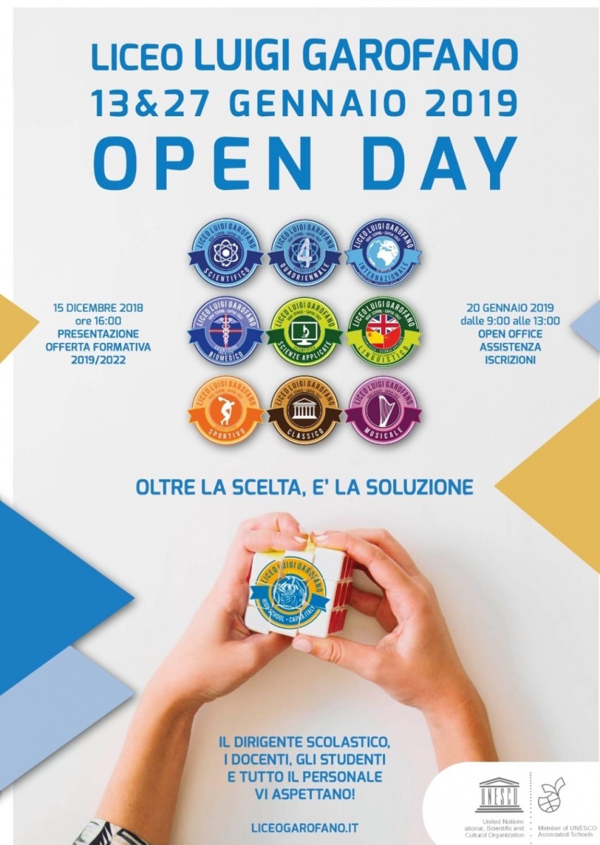 "Se il Liceo Garofano di Capua è l’unico Liceo che, negli ultimi anni, è cresciuto esponenzialmente in numero di alunni, che ha ampliato la sua offerta formativa in numero e qualità di indirizzi di studi, che può offrire la formazione, oltre che con gli indirizzi di studi classici e scientifici, un motivo ci sarà”: si potrebbe sintetizzare così il liceo Statale Garofano di Capua che, domani domenica 27 gennaio, vivrà il suo secondo Open Day.-spiega la nota-Dalle 9 del mattino e fino alle 18 del pomeriggio, alunni e famiglie potranno conoscere di persona i docenti, il personale ed il Preside, ai quali affidare, per i futuri 5 anni, il bene più grande, la formazione di un proprio figlio e la sua crescita educativa e didattica.-si legge nella nota-Un istituto scolastico superiore che ha visto la sua popolazione scolastica quasi raddoppiarsi in pochi anni, passando dagli 800 agli attuali circa 1400 studenti, e che ha ampliato la sua offerta formativa in numero e qualità di indirizzi di studi, atteso che oggi il Garofano può offrire la formazione, oltre che con gli indirizzi di studi classici e scientifici, -spiega la nota-anche attraverso i cosiddetti indirizzi rari: liceo scientifico quadriennale, unico nella provincia; il Liceo sportivo, uno degli unici tre della provincia; il Liceo Musicale, uno dei soli sette della provincia. “Il Liceo Garofano si distingue per l'elevata qualità della sua offerta formativa: l'alto valore dei corsi di studi è assicurato dal fatto che dei 9 indirizzi, quattro sono a numero chiuso, a cui si accede per merito e per test attitudinali, tre a numero limitato e tre ad accesso libero. Una scuola a misura di tutti che privilegia il merito (solo quest'anno più di 500 alunni su 1400 sono stati premiati per aver conseguito la media scolastica superiore 8/10).-spiega la nota-La scuola offre elevati standard di qualità e di cura dei locali, dei laboratori e delle attrezzature. Le aule, gli spazi comuni, le aule speciali, sono confortevoli, luminose e ben attrezzate. Quattro laboratori di informatica e di lingue straniere, un laboratorio di scienze, fisica e chimica,-spiega la nota- LIM, Smart TV, diffusione audio in tutte le aule, una sala teatro, un auditorium, tre sale conferenze, una palestra attrezzata, campo di volley, campo di calcetto, campo di basket, campo di tennis e una pista di atletica, completano la dotazione strumentale dell'istituto. Queste strutture permettono lo svolgimento dell'insegnamento secondo le più moderne tecniche che prediligono la metodologia laboratoriale.-spiega la nota-Ma l'aspetto più interessante che il Liceo Garofano propone, è la straordinaria cura che dedica agli allievi in quanto persone portatori di diritti e dotati di dignità e al loro benessere in quanto meritevoli di rispetto. -conclude la nota-Molta cura viene posta anche ai luoghi a cui si dedica molta attenzione alla pulizia ed al decoro dei locali, perché le persone sono si "quelle che sono" ma diventano ben presto anche "quello che vivono", spiega il dirigente scolastico Giovanni Di Cicco.