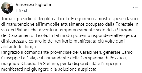 Questo il post pubblicato sulla sua pagina Facebook dal Sindaco di Pozzuoli Vincenzo Figliolia: "Torna il presidio di legalità a Licola. Eseguiremo a nostre spese i lavori di manutenzione all'immobile attualmente occupato dalla Forestale in via dei Platani, che diventerà temporaneamente - si legge nel post - sede della Stazione dei Carabinieri di Licola. In tal modo potremo rispondere all'esigenza di sicurezza e controllo del territorio manifestata più volte dagli abitanti del luogo. Ringrazio il comandante provinciale dei Carabinieri, generale Canio Giuseppe La Gala, e il comandante della Compagnia di Pozzuoli, maggiore Claudio Di Stefano - conclude il post - per la disponibilità e l'impegno manifestati nel giungere alla soluzione auspicata".