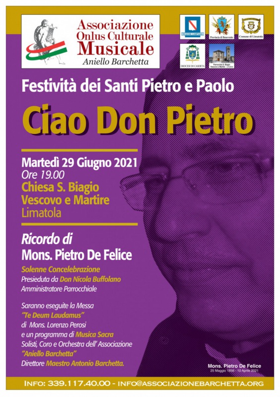 Questa la nota stampa diffusa dall'associazione Onlus 'Aniello Barchetta': "Il 29 giugno, a pochi mesi dalla nascita al cielo l’Associazione Onlus Culturale Musicale “Aniello Barchetta” in occasione della Festività dei Santi Pietro e Paolo, martedì 29 giugno 2021, organizza una serata in memoria di mons. Pietro De Felice - si legge nel comunicato - da tutti conosciuto come don Pietro. “Ciao Don Pietro” è il titolo della serata che si svolgerà a partire dalle ore 19 presso la chiesa di San Biagio Vescovo e Martire di Limatola, di cui il santo sacerdote, morto lo scorso 10 aprile 2021, era parroco. La serata, che vede il patrocinio morale dalla Regione Campania, della Provincia di Benevento, del Comune di Limatola, della Diocesi di Caserta e della parrocchia di San Biagio Vescovo e Martire di Limatola - prosegue il comunicato - sarà dedicata al Ricordi di Mons. Pietro De Felice e prevede una Solenne Celebrazione Eucaristica presieduta da don Nicola Buffolano, che da amministratore parrocchiale è subentrato a don Pietro. L’animazione liturgica sarà a cura del sodalizio “Aniello Barchetta” fondato e diretto dal Maestro Antonio Barchetta di cui è nota la più che quarantennale amicizia fraterna con don Pietro nonché la stretta collaborazione in molteplici attività. Il Maestro Antonio Barchetta - si legge ancora nella nota - che oramai da tre mesi sta lavorando a preparare un altro grande momento celebrativo in memoria di don Pietro De Felice, che probabilmente si concretizzerà entro fine anno, comunica che durante la serata saranno eseguite la Messa “Te Deum Laudamus” di mons. Lorenzo Perosi e un programma di Musica Sacra per soli, coro e orchestra dell’Associazione “Aniello Barchetta” con la direzione - si legge nella nota - dello stesso Maestro Antonio Barchetta. Saranno eseguiti brani sacri che piacevano tanto a Don Pietro. Il Maestro Antonio Barchetta, ringrazia a nome proprio e dell’Associazione Culturale Musicale Onlus“Aniello Barchetta” S.E. Mons. Pietro Lagnese Vescovo di Caserta e Don Nicola Buffolano. Il Sindaco di Limatola Dott. Domenico Parisi e quanti interverranno all’evento. Tutta la manifestazione - prosegue il comunicato - si svolgerà nel rispetto delle prescrizioni della normativa anti covid-19. Il Presidente ringrazia altresì chi segue gli eventi e le attività sul canale Youtube ovvero la proposizione delle manifestazioni, invitando ad iscriversi allo stesso. Un grazie agli Enti Locali Patrocinanti, tutti quanti a diverso titolo rendono fattibile queste iniziative e i mezzi di comunicazione di massa - si legge ancora - che promuovono i cicli di eventi dell’Associazione. Le iniziative dell’Associazione si possono seguire attraverso le news del sito: associazionebarchetta.org oppure il gruppo social (...) dove sarà possibile condividere e consultare i contributi stampa, foto, video ed osservazioni sull’evento, e ancora - conclude il comunicato - attraverso la pagina social Facebook associazionebarchetta".