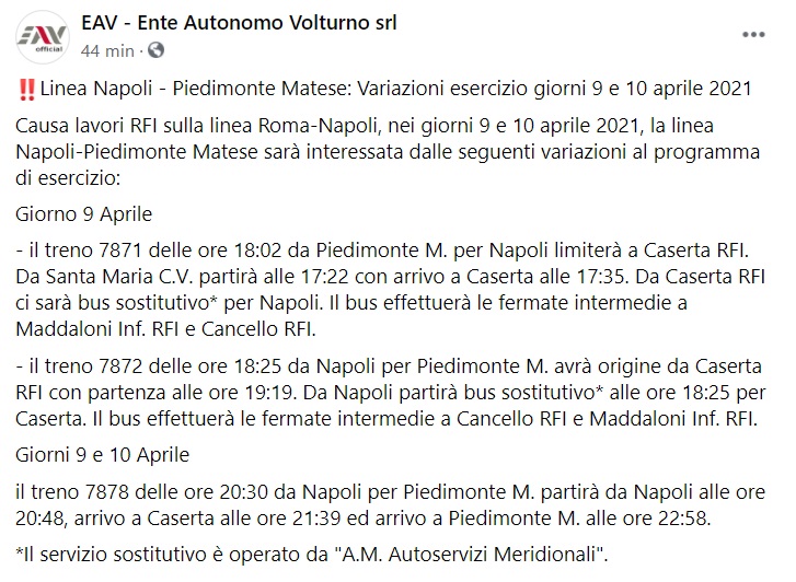Questo quanto pubblicato sulla pagina facebook dell'EAV: