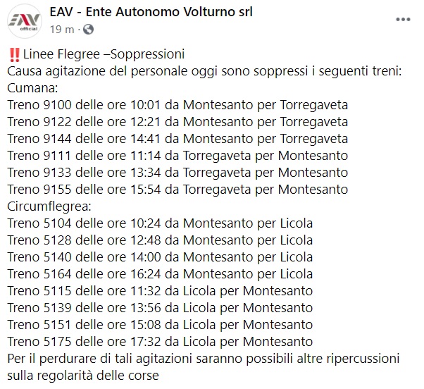 Questo quanto apprendiamo dalla pagina fb dell'EAV: "Linee Flegree –Soppressioni Causa agitazione del personale oggi sono soppressi i seguenti treni: Cumana: Treno 9100 delle ore 10:01 da Montesanto per Torregaveta Treno 9122 delle ore 12:21 da Montesanto per Torregaveta Treno 9144 delle ore 14:41 da Montesanto per Torregaveta Treno 9111 delle ore 11:14 da Torregaveta per Montesanto Treno 9133 delle ore 13:34 da Torregaveta per Montesanto Treno 9155 delle ore 15:54 da Torregaveta per Montesanto Circumflegrea: Treno 5104 delle ore 10:24 da Montesanto per Licola Treno 5128 delle ore 12:48 da Montesanto per Licola Treno 5140 delle ore 14:00 da Montesanto per Licola Treno 5164 delle ore 16:24 da Montesanto per Licola Treno 5115 delle ore 11:32 da Licola per Montesanto Treno 5139 delle ore 13:56 da Licola per Montesanto Treno 5151 delle ore 15:08 da Licola per Montesanto Treno 5175 delle ore 17:32 da Licola per Montesanto Per il perdurare di tali agitazioni saranno possibili altre ripercussioni sulla regolarità delle corse"