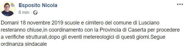 Questo quanto pubblicato dal Sindaco di Lusciano, Nicola Esposito: