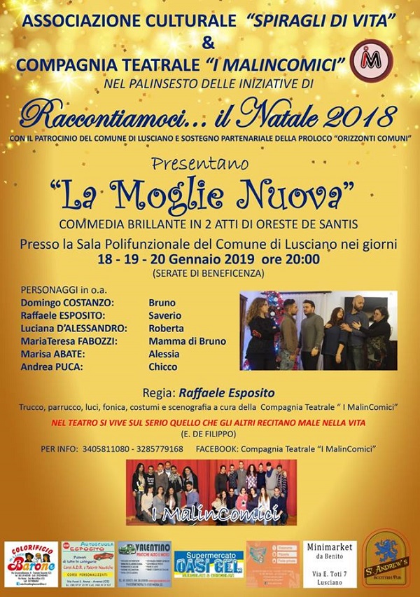 "Tre serate all`insegna del divertimento quelle che chiuderanno la rassegna “Raccontiamoci il Natale 2018 a Lusciano”, promossa dall`amministrazione - si legge nel comunicato stampa - comunale ed organizzata dalla Pro Loco “Orizzonti comuni”. L`intero progetto e` stato cofinanziato dall`Unione Europea, dallo Stato Italiano e dalla Regione Campania nell`ambito del Poc Campania Fesr 2014-2020. Venerdi` 18 gennaio, sabato 19 e domenica 20, tutti a teatro: alle 20, a palazzo Ducale, spettacolo teatrale “La moglie nuova”, commedia brillante in due atti di Oreste De Santis, a cura dell`associazione “Spiragli di vita” e della compagnia teatrale “I Malincomici”. Lo spettacolo si terra` nella sala polifunzionale del Comune di Lusciano e tutte e tre saranno serate di beneficenza. A salire sul palco saranno: Domingo Costanzo (Bruno), Raffaele Esposito (Saverio), Luciana D`Alessandro (Roberta), Maria Teresa Fabozzi (Mamma di Bruno), Marisa Abate (Alessia) e Andrea Puca (Chicco). A curare la regia - si legge nel comunicato stampa -Raffaele Esposito. “Possiamo tracciare un bilancio piu` che positivo anche dell`edizione di quest`anno – sottolinea il sindaco di Lusciano Nicola Esposito – Tantissime le persone che hanno trascorso le feste natalizie in nostra compagnia, partecipando ai numerosi eventi in cartellone”. “C`e` un grande lavoro dietro a tutta l`organizzazione del cartellone. Per questo voglio ringraziare Antonella Bocchetti, presidente della Pro Loco “Orizzonti comuni” per il lavoro svolto – spiega il delegato agli Eventi Raffaele Esposito – Tutte le iniziative promosse hanno tenuto conto dei desideri e delle aspettative manifestateci dai luscianesi”. Gli ultimi appuntamenti di “Raccontiamoci il Natale” hanno riscosso enormi consensi. Domenica 6 gennaio c`e` stata una bellissima befana in piazza Giovanni Paolo II, che ha distribuito ai bambini tante leccornie. Alle 20, invece, nel salone parrocchiale, tombolata con premi; il ricavato e` stato - si legge nel comunicato stampa -devoluto alla Caritas. Il giorno successivo, ricorrenza della festa liturgica di San Luciano, patrono cittadino, altri due eventi: alle 18 solenne celebrazione eucaristica nella chiesa Santa Maria Assunta. Nel giorno del martirio del Santo protettore luscianese, messa presieduta da Sua Eccellenza monsignor Angelo Spinillo, vescovo di Aversa. Alle 19.30, sempre nel salone parrocchiale, divertentissimo spettacolo di musica e prosa "Stasera al varieta`" con gli attori e cantanti Natalia Cretella e Lello Pirone, il tenore Giacomo Mosca e al pianoforte il maestro Fabio Mirabelli. Al termine della serata l`estrazione di un cesto con prodotti tipici locali. “Il programma proposto – conclude la presidente - si legge nel comunicato stampa -della Pro Loco “Orizzonti comuni” Antonella Bocchetti – ha avuto anche l`obiettivo di confermare, semmai ce ne fosse ancora bisogno, la genuinita` e la unicita` dei prodotti tipici enogastronomici della nostra - si legge nel comunicato stampa -cittadina, che tutta Italia ci invidia. Le aziende locali rappresentano il fiore all`occhiello della nostra economia. Proprio recentemente il quotidiano “La Repubblica” ha inserito “I Borboni” tra i cinque spumanti italiani da bere per festeggiare l`arrivo del 2019. Questa cosa rappresenta motivo di soddisfazione per tutta - conclude il comunicato - Lusciano”."