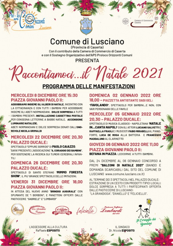 Questo il comunicato stampa diffuso dal Comune di Lusciano: "L'Amministrazione Comunale di Lusciano, con il contributo della Camera di Commercio di Caserta e con il sostegno organizzativo dell'Aps Pro Loco “Orizzonti Comuni”, presenta “Raccontiamoci il Natale... 2021”, un programma pensato per grandi - si legge nel comunicato - e per piccini e ricco di eventi che partono dall'8 dicembre e terminano il 6 gennaio. “Anche quest'anno proponiamo il cartellone di 'Raccontiamoci il Natale'. In un periodo difficile come questo, il valore autentico e genuino della tradizione scalda il cuore e diventa certezza per l'intera cittadinanza”, spiega il sindaco Nicola Esposito. “Quest'anno abbiamo aggiunto - prosegue il comunicato - una novità: il concorso a premi “Balconi di Natale 2021”, dal 24 dicembre al 6 gennaio (bando e domanda scaricabili dal sito del Comune di Lusciano (...). Un modo per sentirci sempre più parte di una comunità”, conclude l'assessore delegato alla Cultura Raffaele Esposito. Si parte - si legge ancora nel comunicato - mercoledì 8 dicembre alle 15:30 in piazza Giovanni Paolo II con “Addobbiamo insieme gli alberi di Natale: incontro con la cittadinanza e con tutti i bambini per addobbare insieme gli abeti normandiani, dolce sorpresa a tutti i bambini presenti, installazione della cassettina postale - prosegue il comunicato - per la consegna delle letterine a Babbo Natale e accensione delle luminarie natalizie (gli abeti normandiani e la dolce sorpresa saranno donati dall'onorevole Nicola Grimaldi). Mercoledì 22 dicembre alle 20:30 al Palazzo Ducale spettacolo “Eppure sorrido” di Paolo Caiazzo. Sarà presente l'associazione “Il coraggio dei bambini” per sostenere la ricerca sui tumori cerebrali infantili. Domenica 26 dicembre - si legge ancora - alle 20:30 al Palazzo Ducale spettacolo di Santo Stefano “Mimmo Foresta Show”, il più grande spettacolo delle imitazioni. Venerdì 31 dicembre alle 18 in piazza Giovanni Paolo II, in attesa del nuovo anno, brindisi augurale con spumante de “I Borboni” e panettoni offerti dalle pasticcerie “Gabriele”, “Lombardi” e “La Dea del Dolce”. Domenica 2 gennaio 2022 alle 18, nella piazzetta antistante Oasi gel, spettacolo - si legge ancora - per bambini e non: “Favolando”, con vari personaggi delle favole. Mercoledì 5 gennaio alle 20:30 nel Palazzo Ducale spettacolo di musica classico-napoletana “Natale in... canta Napoli” con gli attori Luciano Salvetti e Raffaella Fraoli e i musicisti Fabio Mirabelli al pianoforte, Luca De Rosa alla batteria e Francesco Maddaloni al clarinetto. Giovedì 6 gennaio alle 11, in piazza Giovanni Paolo II, befana in piazza: leccornie a tutti i bambini. Al termine dei tre spettacoli nel palazzo Ducale, estrazione di un cesto con prodotti tipici locali e dolce sorpresa a tutti i partecipanti - conclude il comunicato - offerta dalle pasticcerie di Lusciano: “La Grandiosa”, “D'Aniello” e “Feliciello”.